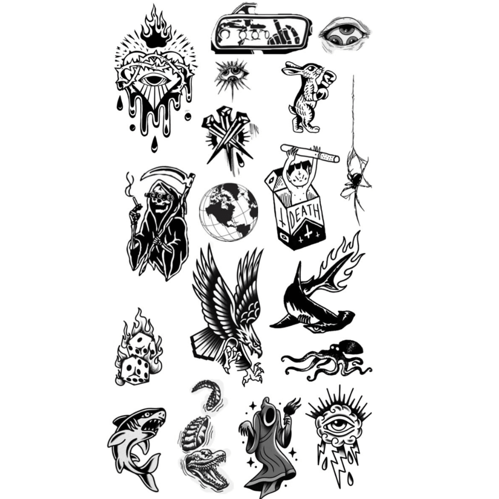 The After Hours pack is a bold mix of classic flash and dark symbolism, blending raw instinct with rebellious energy. From the grim reaper, flaming dice, dagger bursts, coffin kid, and lightning-struck eyes to fierce animals like the eagle, shark, octopus, and serpent, each design carries themes of mortality, luck, power, survival, and chaos. The burning swallow, melting sacred heart, and striking symbols add that traditional tattoo style, while the clean blackwork style keeps everything sharp and wearable. This collection is for those who lean into intensity, embrace risk, and wear their edge without apology.