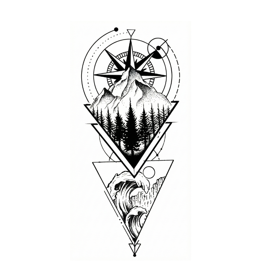 This design is about alignment. The mountains stand for purpose and long-term vision. The forest represents growth through patience and silence. The compass above points to direction and inner truth, while the crashing waves below symbolize chaos, emotion, and life’s unpredictability. Stacked together, it tells one clear story: stay grounded when life pulls you in different directions. No matter how rough the waters get, your direction doesn’t change. This tattoo is for someone who trusts their path, even when the journey isn’t calm.